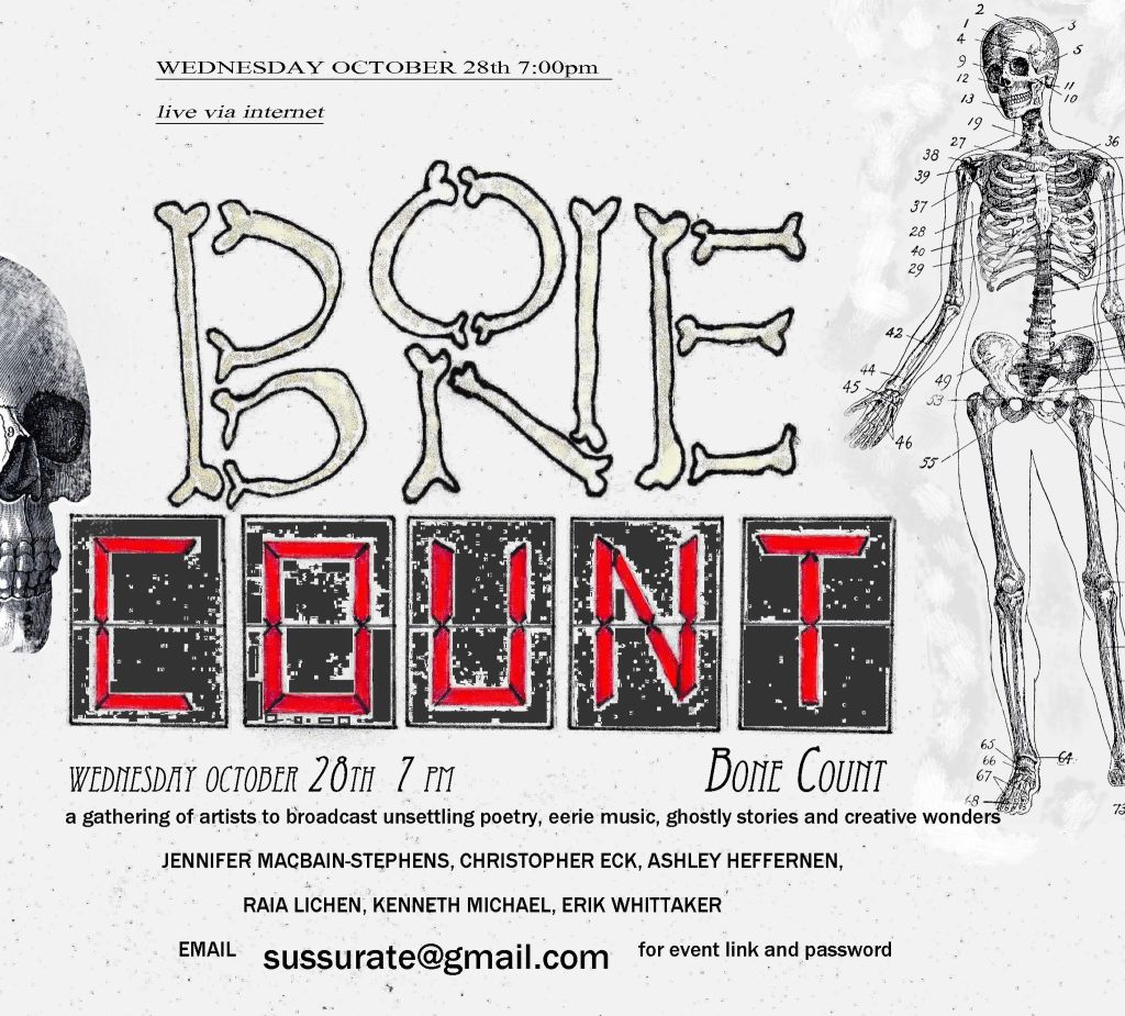 I’ll be reading from my grey book press chapbook “The Female Citizens of Sunshine Nation Face off with Light Sucking Demons,” Wednesday, October 28th, 7pm Central time, as part of the zoom webinar reading BONE COUNT. Can’t wait to read these creepy poems along with a few friends! E-mail the address in the poster for the link! Check us out. October 23, 2020 ~ jennifermacbainstephens ~ Leave a comment